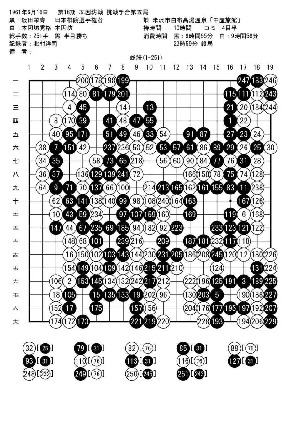 1951年的第6期本因坊战输给桥本宇太郎之后,坂田荣男似乎与本因坊战始终无缘。几乎年年被视为挑战者头号热门,却屡屡只得循环圈第二,无法取得挑战权。据说他曾放言:“那就等到高川格先生拿满10期时再去挑战吧。”果然,1961年,他获得了向冲击本因坊十连霸的高川秀格发起挑战的资格。坂田荣男上来便连下三城;在第4局被高川格扳回一局后,一下是第5局的内容。